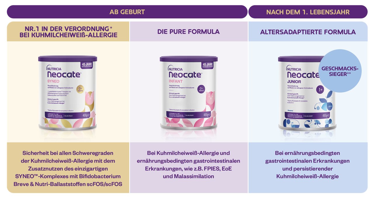 Neocate® ist eine vollständig milchfreie Spezialnahrung auf Basis von non-allergenen Aminosäuren, die von den meisten Kinderärzten erfolgreich zur diätetischen Behandlung der Kuhmilcheiweiß-Allergie eingesetzt wird. Sie bietet eine sichere und effektive Ernährungstherapie für Säuglinge und Kinder mit bestätigter Allergie gegen Kuhmilch sowie bei multiplen Nahrungsmittelallergien oder schweren Resorptionsstörungen.
