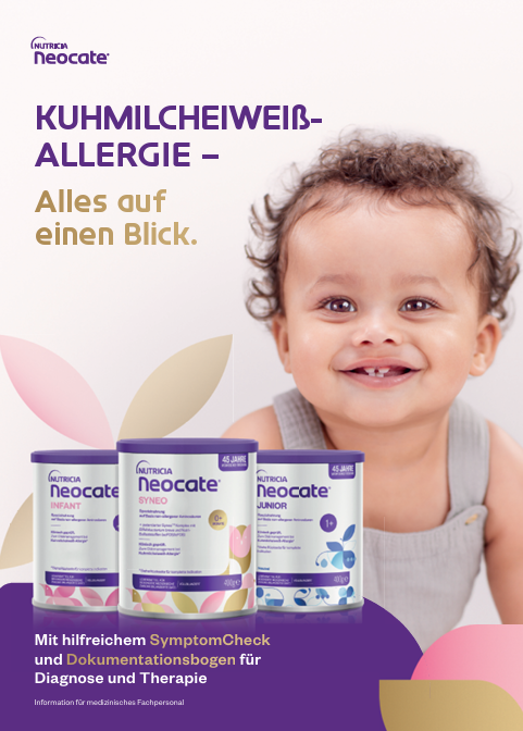 Therapie: Bei Verdacht empfiehlt sich eine kuhmilchfreie Eliminationsdiät. Eine Aminosäuren-basierte Spezialnahrung wie Neocate bietet dabei eine sichere diagnostische und therapeutische Option – insbesondere bei nicht gestillten Säuglingen.